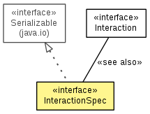 It is required that the InteractionSpec interface be implemented as a JavaBean for the toolability support. The properties on the InteractionSpec implementation class should be defined through the getter and setter methods pattern. An implementation class for InteractionSpec interface is required to implement the java.io.Serializable interface.